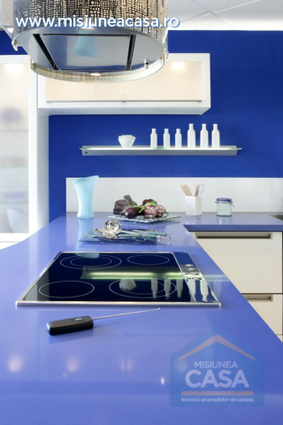 Sparge albul cu gri metalizat. In cazul asta nu este nevoie sa alegi o anumita culoare pentru pereti, scaune sau blatul mesei, este suficient ca toate electrocasnicele, ustensilele si blatul de la masa si dulapurile din bucatarie sa fie gri metalizat.Sparge albul cu albastru. O culoare care sigur te duce cu gandul la cer senin, mare linistita, soare, cald si relaxare. Daca ti-ai organizat bucataria cu un mare front de lucru, in mijlocul caruia este o plita vitroceramica iar in jurul ei ai suficient spatiu sa pregatesti mancarea dar sa si servesti masa, atunci blatul acesta de culoare albastra este suficient pentru a rupe creativ monotonia albului imaculat