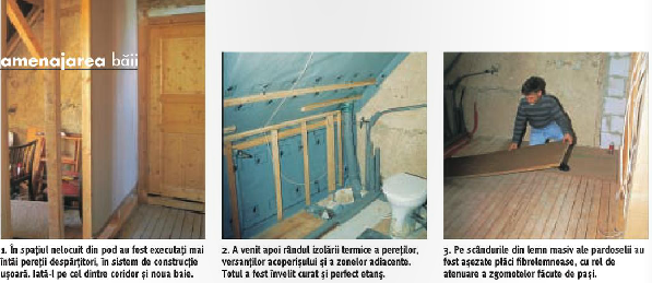 Initial un spatiu unitar, podul casei a fost compartimentat cu ajutorul unor placi de gips-carton, pe structura din lemn. Pentru mascarea noilor conducte de apa aferente WC-ului si dusului, peretele de zidarie existent a fost captusit spre interior cu alte placi. Apoi, versantii acoperisului, popii sarpantei si plafonul au fost termoizolati prin pulverizare cu fulgi de celuloza.