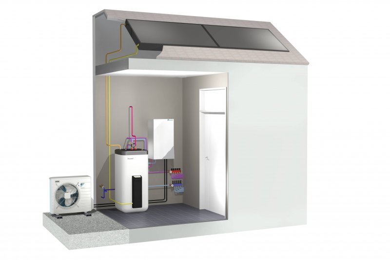 Pompa de caldura cu sursa subterana Daikin Altherma cu temperatura ridicata furnizeaza atat apa calda, cat si caldura si este solutia recomandata de expertii Avi Compact pentru inlocuirea centralei termice traditionale. Sistemul se conecteaza perfect la conductele si radiatoarele existente.