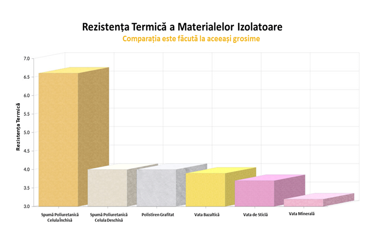 Cea mai mica caloare a conductivitatii termice o regasim la cel mai avansat material de izolare – spuma poliuretanica cu celula inchisa, aceasta are valoarea de 0.021W/mK.