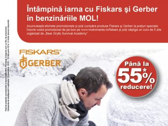 Din a doua parte a lunii noiembrie 2013 produsele Fiskars și Gerber pot fi achiziționate la prețuri speciale în cadrul campaniei ”Întâmpină iarna cu Fiskars și Gerber în benzinăriile MOL”. Cumpărătorii pot beneficia de reduceri de până la 55% în schimbul etichetelor promoționale obţinute în urma cumpărăturilor efectuate în benzinăriile MOL. Campania promoțională se derulează timp de trei luni, până la 16 februarie 2014.Promoția de iarnă aduce un nou sortiment de produse Fiskars și Gerber, special alese astfel încât cumpărătorii să fie pregătiți pentru orice situație neprevăzută. De la unelte ergonomice pentru zăpadă, în cazul ninsorilor abundente, la topoare de diferite dimensiuni pentru lemnele de foc și până la diverse ustensile practice precum cuțitul tactic, minilanternă sau șurubulenițe, veți avea la îndemână produse de înaltă calitate, special concepute de designerii de la Fiskars și Gerber. Mai mult, promoția include și produse de menaj din gama Fiskars, cuțite de bucătărie și foarfeci, utile în orice gospodărie.