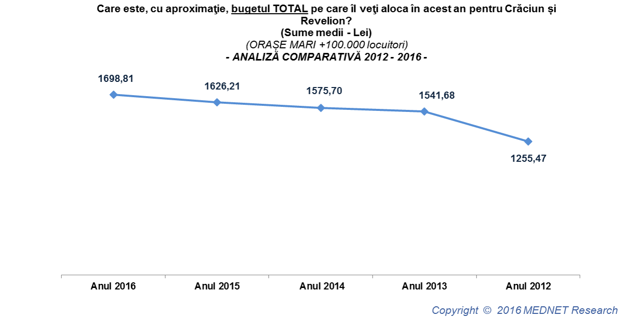 Conform datelor studiului „Cumpărăturile de Sărbători”, realizat de MEDNET Marketing Research Center în mediul urban (orașe mari +100.000 locuitori, orașe mijlocii 30.000 – 100.000 locuitori și orașe mici sub 30.000 locuitori), bugetul total (Crăciun și Revelion) alocat pentru Sărbători în acest an este estimat la 1.660,87 lei.