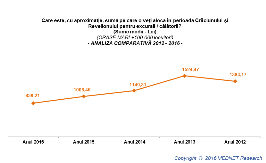 În orașele mari, cei care se vor bucura de Sărbătorile de Iarnă mergând în excursii / călătorii, sunt dispuși să aloce un buget mai mic, comparativ cu anul 2015 (839,21 lei în 2016 și 1.008,46 lei în 2015).